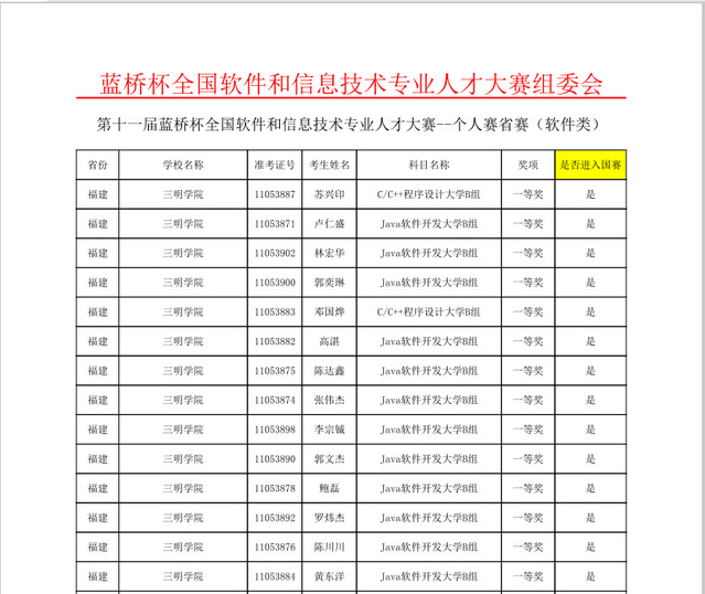 由工业和信息化部人才交流中心主办的第十一届蓝桥杯全国软件和信息技术专业人才大赛个人赛省赛已顺利结束,其中福建省个人赛有30多所高校近千人参赛,我校信息工程开元平台(中国)科技公司共选拔32名同学参赛,获一等奖14个、二等奖12个、三等奖5个。
