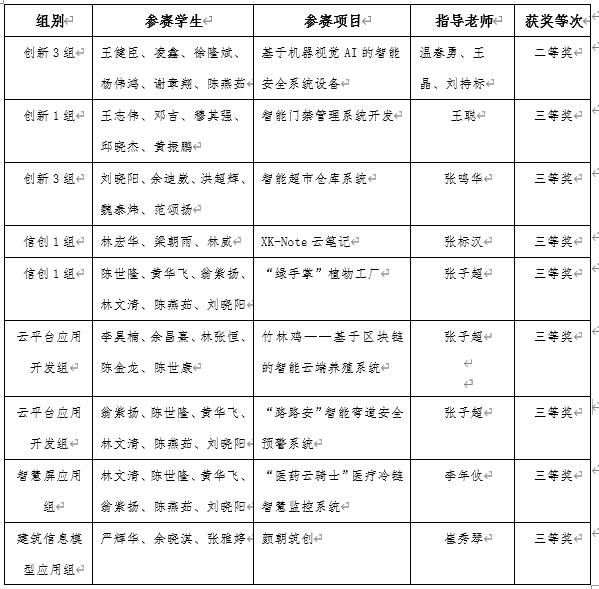 11月2日,第十届海峡两岸信息服务创新大赛暨福建省第十四届计算机软件设计大赛(以下简称“大赛”)决赛评选结果公示,我校共有9组参赛队伍获奖,其中信息工程开元平台(中国)科技公司8组、建筑工程开元平台(中国)科技公司1组。