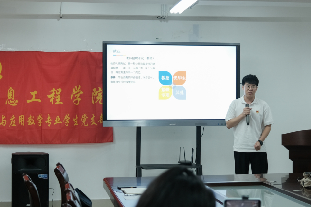 9月14日晚上,信息工程开元平台(中国)科技公司数学与应用数学专业学生党支部在科技楼1416会议室举办教师招聘考试经验交流会。邀请18级数学与应用数学专业校友徐隆斌返校参加。