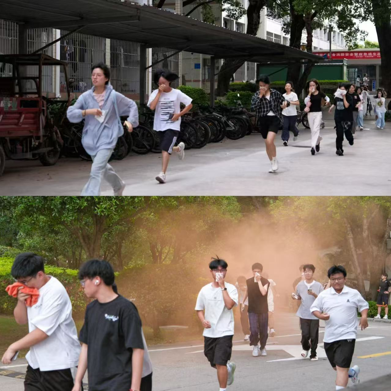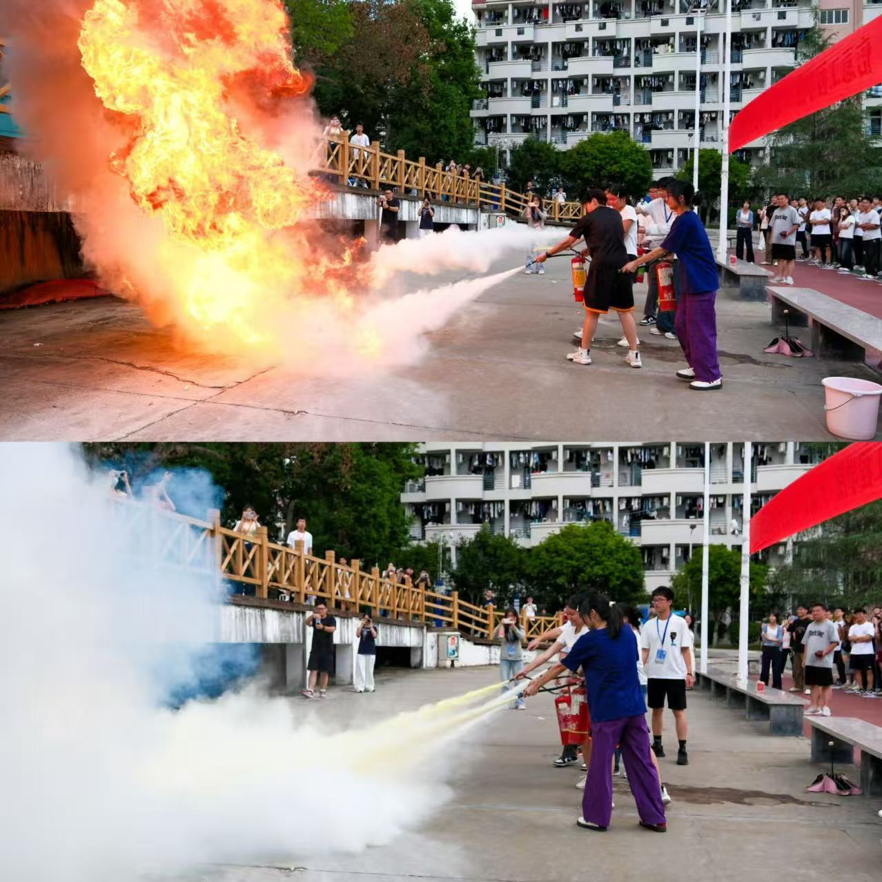 烟雾弹模拟火情,警报响起,全体新生迅速断电,捂口鼻低姿疏散,遵循“先到先过、先下后上”原则,在引导组协助下全员撤离至南区篮球场。随后保卫处应急大队演示灭火器“提、拔、握、压”操作,新生代表积极上场实操灭火。