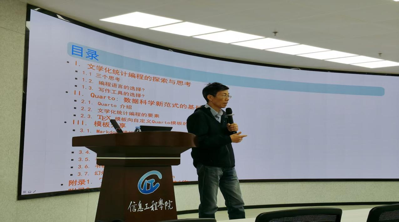 汤银才教授结合自身的教学和科研工作,围绕文学化统计编程,介绍了编程语言的选择,写作工具的选择和数据科学新范式的基础。并结合一些具体案例,详细介绍了如何运用AI,以数据分析为中心的全场景生态建设,展示了Quarto出版系统的强大功能,为广大师生提供了多条科研实践途径。